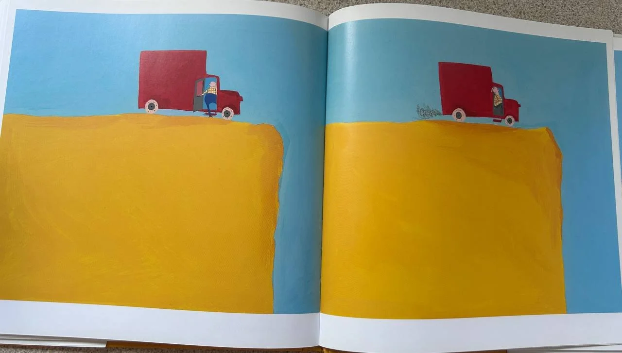 The book then reverses. If we look it, it’s like steps. It starts with the van driving along the road, then it stops at the age of the cliff, the man puts his foot on the floor, gets out of the car. Now it goes back. He puts a foot in, gets in the car, drives off. Back to square one, the whole day might get forgotten.