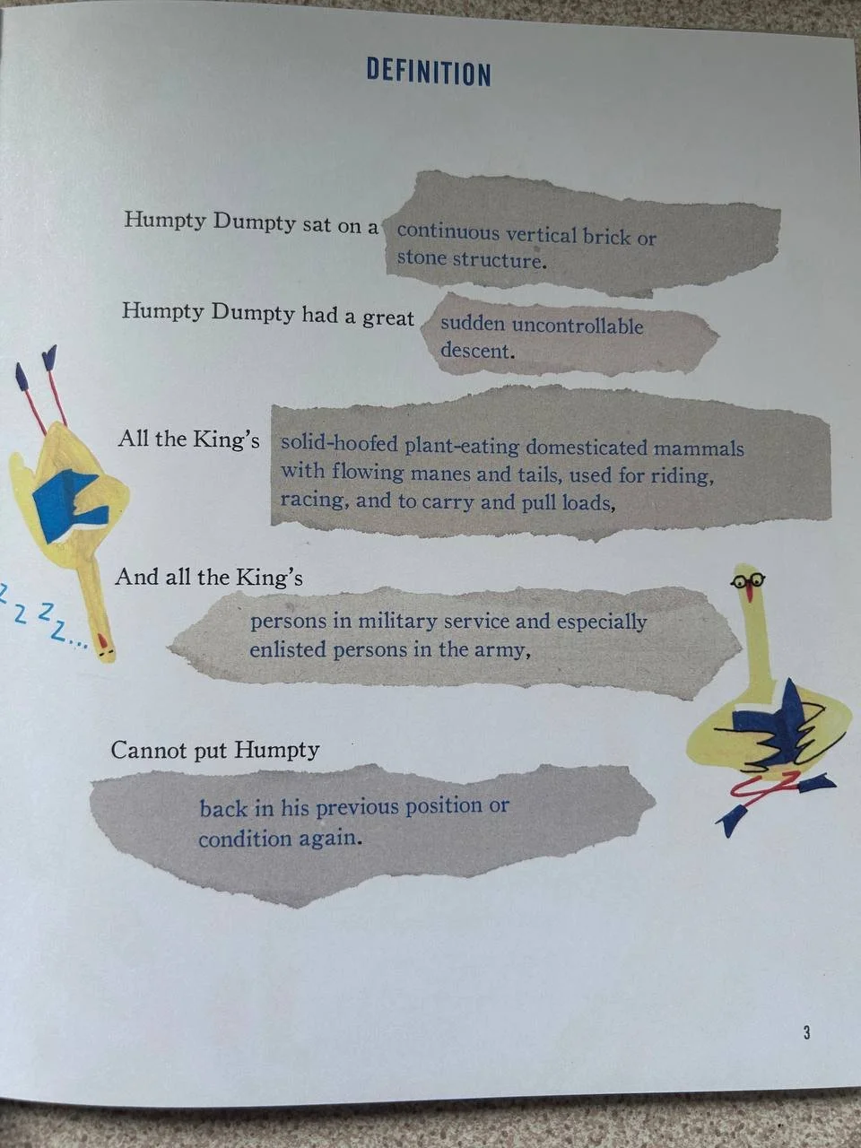 Page 3 is devoted to definitions. I asked the students to copy any nursery rhyme and change some words to their definitions. Then during the lesson they were reading out their rhymes and their classmates were to guess the words.