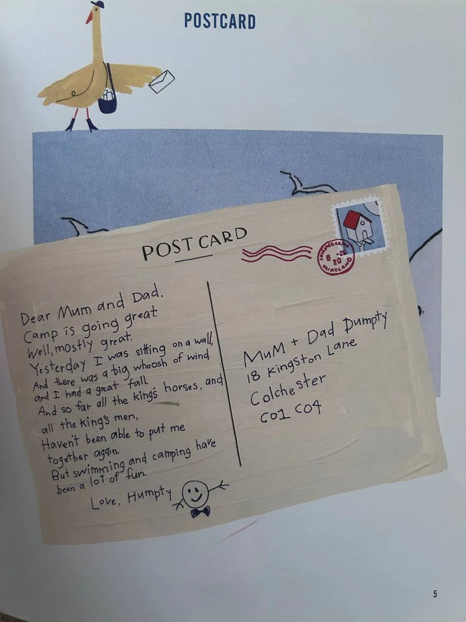 Page 4 is a postcard. Humpty Dumpty sends his mum and dad one and mentions how he had a great fall. This exercise also covers writing addresses and names, including foreign ones when the order is opposite to the UK traditions.